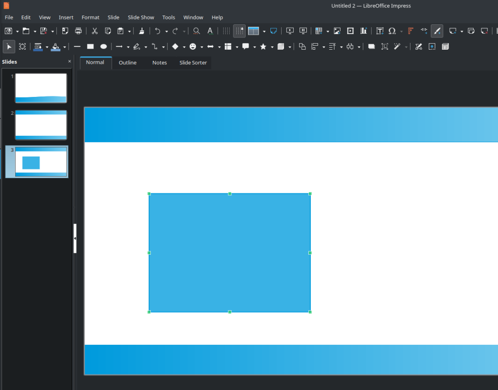 I have had an issue for a while (since I created my own custom color palette), and I finally found the solution. LibreOffice Impress comes with a standard template with default colors. As a college professor and researcher, I create lots of presentations. Since LibreOffice is my go-to software for this, I’m always looking for ways to streamline creating new slide decks. Once I decided on a custom color palette, I then started to get annoyed that every time I drew a box, it was still filled with the default color in LibreOffice, like this: