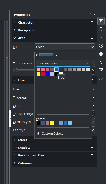 Then draw the box you want. Once you’ve drawn it, select it, and hit F11 to bring up the context sidebar in LibreOffice (it will open up “Styles,” which we’ll return to in a moment). Under the Properties tab, select the Fill color you want in the “Area” tab. And, while you’re at it, if you want to change the “Line” color, do that as well (it’s just below “Area”):