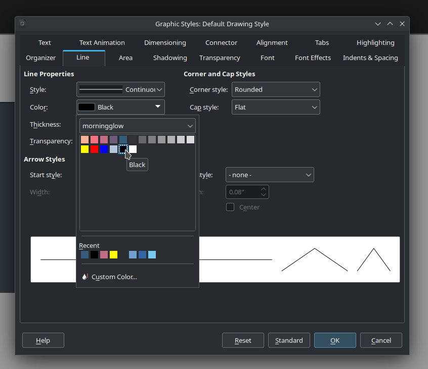That will set the default drawing style. But that will go away when you open a new LibreOffice Impress file. The next part is how you make sure this default comes back every time you open a LibreOffice Impress file.