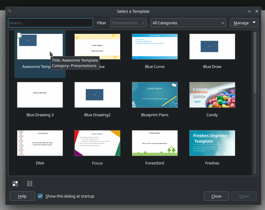 When you do that, the next time you open a new LibreOffice Impress file, you’ll see your template among the list of options. You can either select it or just close the “templates.”
