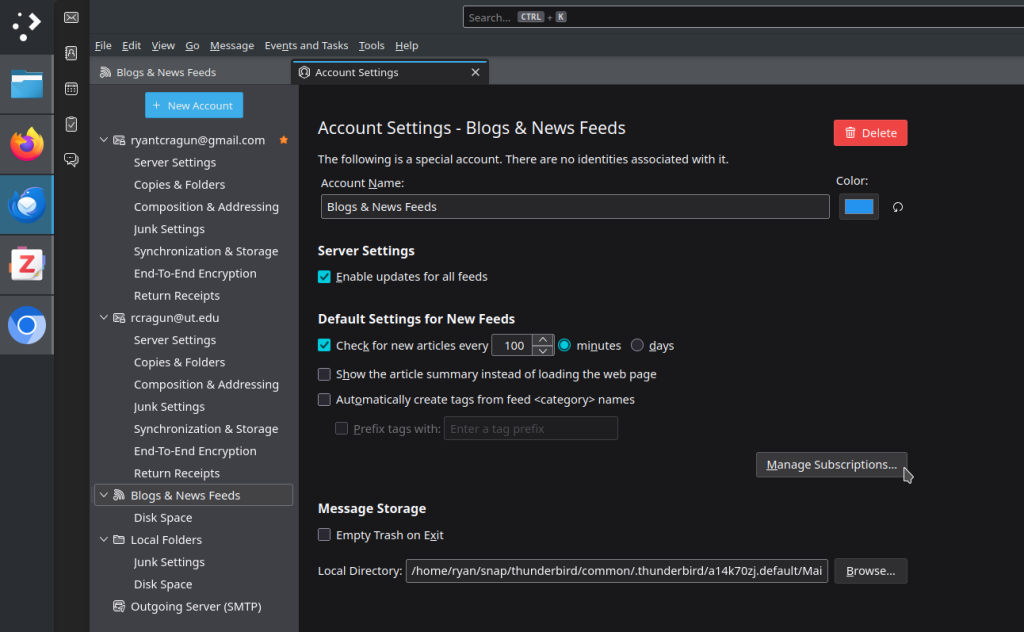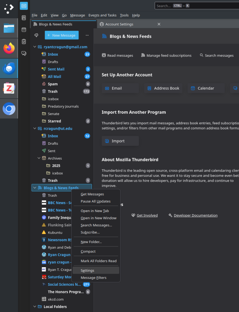 I use three different computers. I also use RSS feeds to get some of my news. For a while, I was paying for an online service that managed my RSS feeds. But I found I wasn’t accessing it enough to justify the cost. Since I have switched to Thunderbird for managing my email, I figured I’d try out the RSS feed manager as well. The primary drawback to using Thunderbird for this is that it doesn’t synchronize my RSS feeds across my computers. But, again, I don’t use my RSS feeds enough to really justify worrying about that.