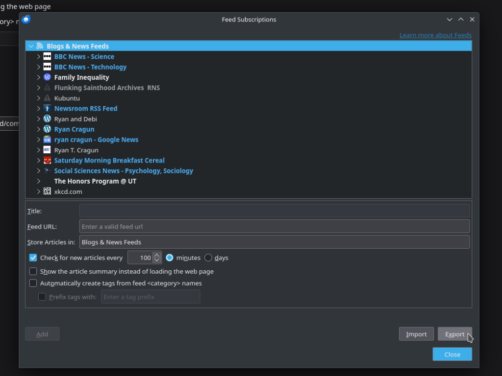 You’ll get a new window. That window will show you all of your feeds and subscriptions. You’ll want to select the “Export” option on the bottom right: