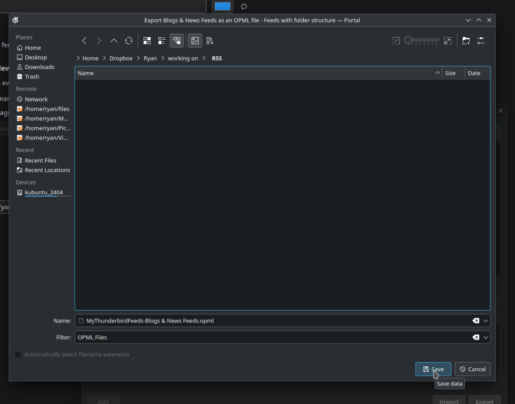 You’ll get a new window asking you where to save the .opml file, which is an XML file with all of your feed information: