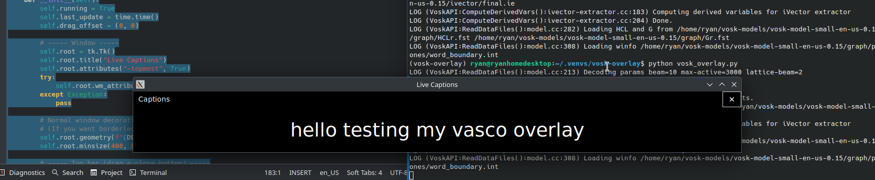 You should now have all the necessary packages and models installed. But you still need the overlay that utilizes all of this software. Enter ChatGPT and a bit of vibe coding to make the following Python script. When run, this will create an overlay on your computer where the output of the voice-to-speech software is displayed. The overlay can be moved and resized. It also has an “X” in the top right corner to close it. There are some adjustments that you can/should make, I’ll note below. Open a text editor and paste the following code inside it. Then save it as something like “vosk_overlay.py” inside your virtual environment (e.g., ~/.venvs/vosk-overlay/vosk_overlay.py). Here’s the Python code: